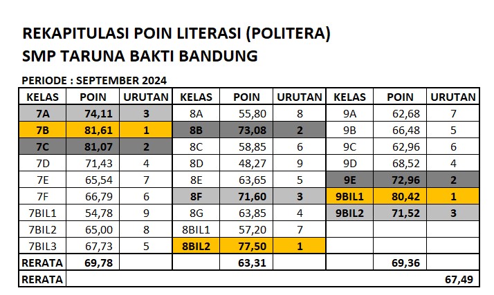 Laporan Poin Literasi (POLITERA) Bulan September 2024 Kelas VII SMP Taruna Bakti
