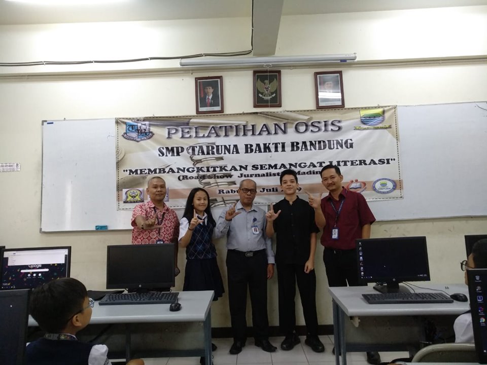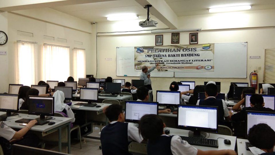 Untuk terus menumbuh kembangkan pematahan literasi untuk peserta didik di SMP Taruna Bakti, hari ini Rabu tanggal 31 Juli dilkasanakan kegiatan pelatihan jurnalistik. Acara pelatihan dibuka oleh Bapak Wakil Kepala Sekolah bidang Kesiswaan Bapak Imam Wibawa Mukti, Pemateri Bapak Riyanto bersama Tim dari Bandung TV memberikan materi jurnalistik. Kegiatan yang dilaksanakan di laboratroim Kompuetr ASMTB berjalan dari pagi hingga siang.