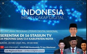 Presiden Republik Indonesia, Jokowi kemarin Kamis (20/5) meluncurkan program Literasi Digital Nasional. Indonesia Makin Cakap Digital itulah slogan yang akan terus digelorakan. Kewajiban kita semua adalah dengan membanjiri konten positif lawan konten negatif. Perbanyak konten kreatif yang menyejukan untuk menyerukan perdamaian. Internet harus mampu meningkatkan produktivitas masyarakat sehingga meningkatkan nilai ekonomi. Literasi digital ini merupakan kerja besar yang dilakukan tidak hanya oleh pemerintah. Pemerintah memerlukan dukungan dari seluruh komponen bangsa. Semakin banyak yang melek digital, pemerintah memberikan apresiasi kepada 110 lembaga dan berbagai komunitas yang terlibat dalam Program Literasi Digital Nasional. Harapan Presiden gerakan ini terus menggelinding dan terus membesar agar makin cakap memanfaatkan literasi digital. Manfaatkan internet ini sebagai kegiatan edukatif dan produktif.