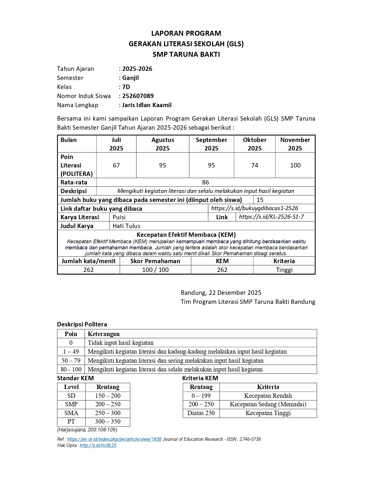 Rapor Literasi Rapor Literasi SMP Taruna Bakti October 2, 2024 Admin TIK Versi 3 (1 Des 2025) Versi 2 (23 Nov 2024) Versi 1